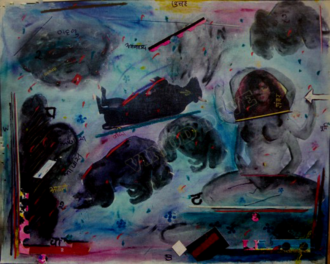 In the artist's words "My ancestors had left a heritage of some very fascinating illustrated books on major Hindu epics that contained interesting drawings in which each character was identified with his or her name written underneath and even phrases telling what that character is doing...". That these illustrated manuscripts are an intrinsic part of storytelling, that as a body of work they stand in sharp variance to the pop iconic image of the bazaar was not lost on the young boy. Ajay Sinha in Contemporary Art in Baroda writes "By the time Vinod Dave finished his MFA, he had mastered oil painting as no one in his generation had." The early work was about sexuality as distinct from the sexual act. Dave, positioning himself as voyeur, part participant, part ineffectual presence, painted the press of bodies and limbs in a frontage of visual titillation. Dave has read the culture of the street to denote a potentially explosive admixture of sex, religion and violence. At one or another phase of his painting one or other ingredient in this heady brew has been dominating.